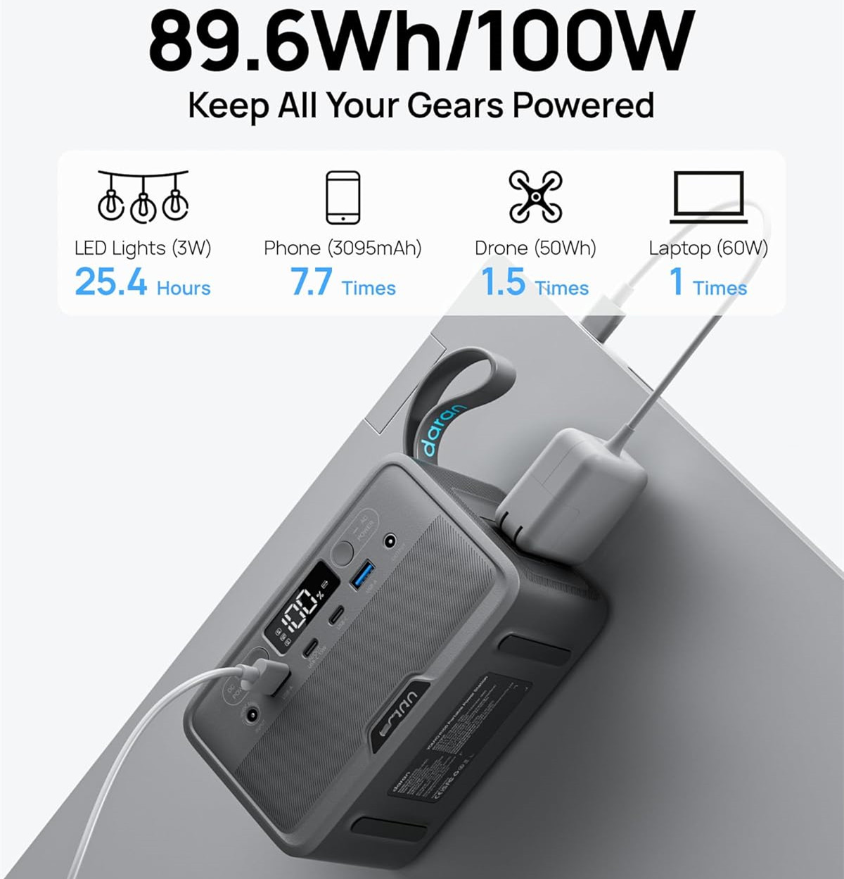 Capacity: 100W(200W Peak)/89.6Wh/280000mAh