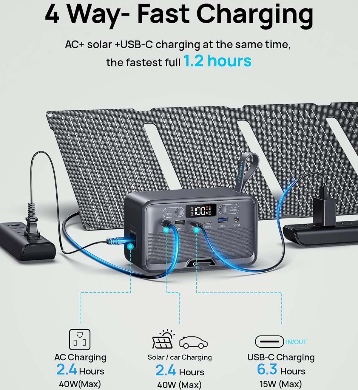 [Solar Fast Charge] -With unique fast charging technology,the portable generator can be charged from 0-80% just in 1.5hrs. The solar power bank power station has Four methods to charging: AC wall socket fast charging, USB-C DC two-way PD fast charging(AC and DC can be charged at the same time) ,car charging and solar panel charging.Fast charging solar power bank portable charger suitable for for emergency home backyard outdoor power outages off-grid camping essentials